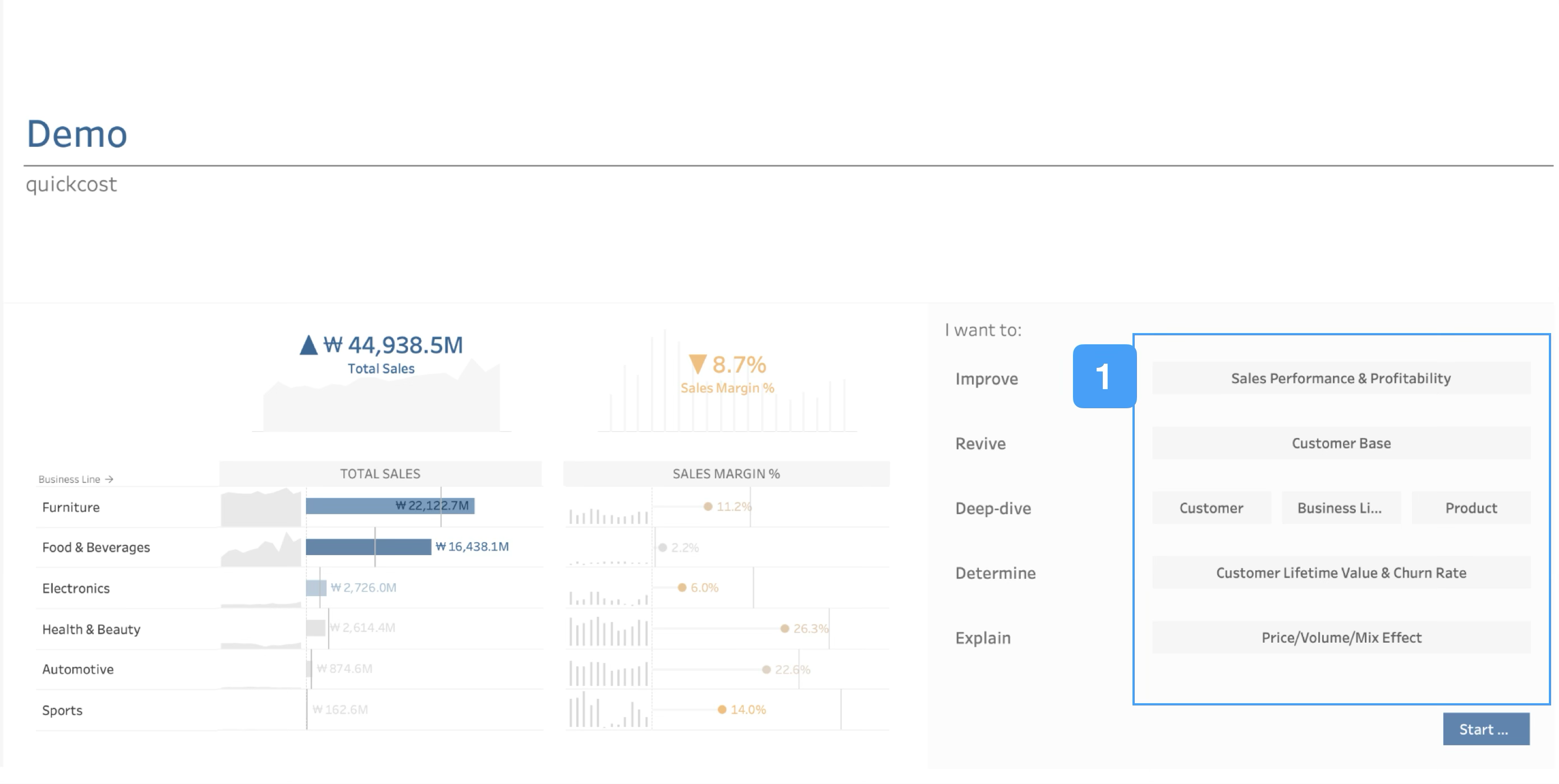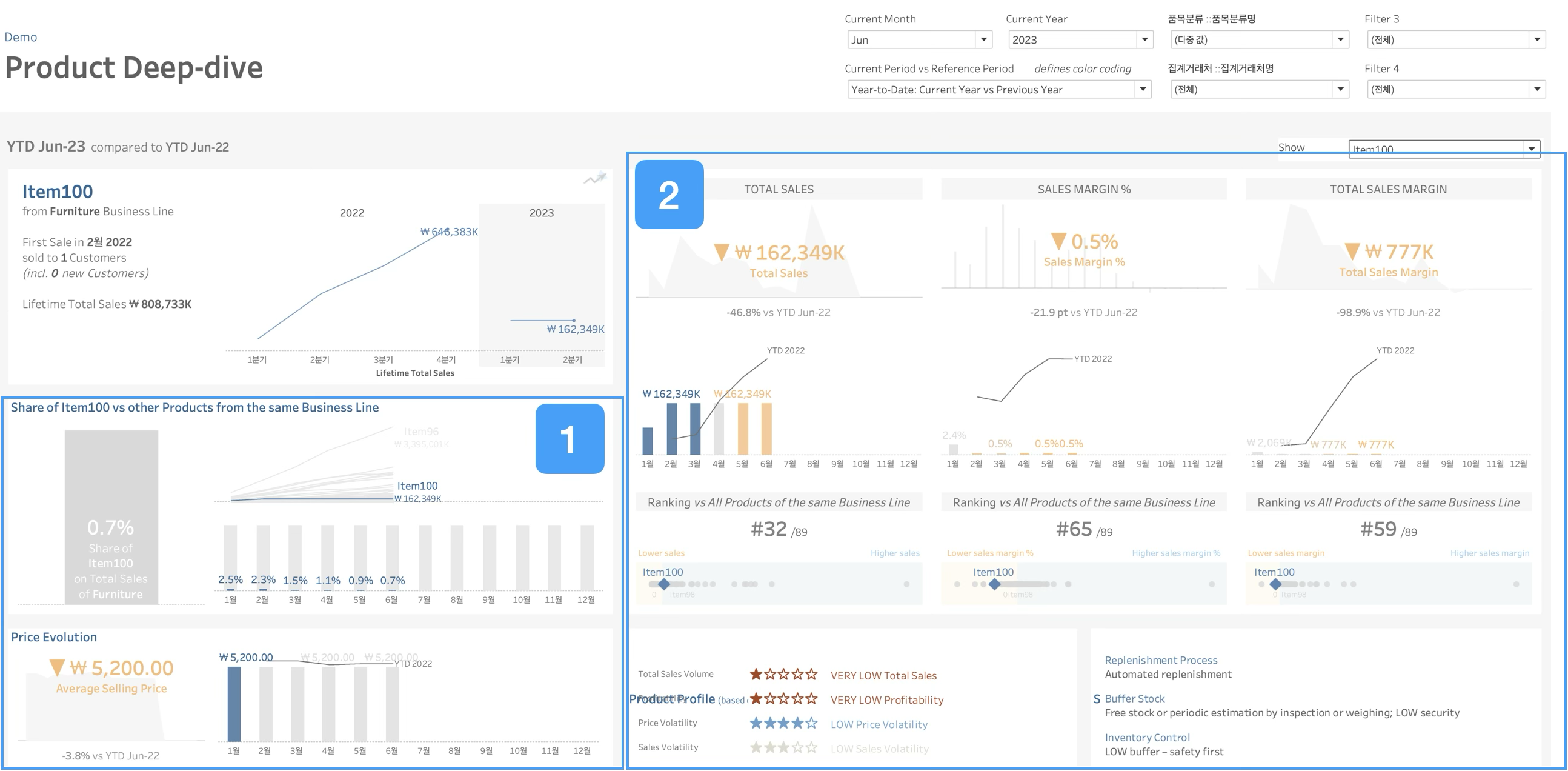 제품, 고객, 사업부를 클릭하면 해당 부분의 심층분석 대시보드로 이동합니다.