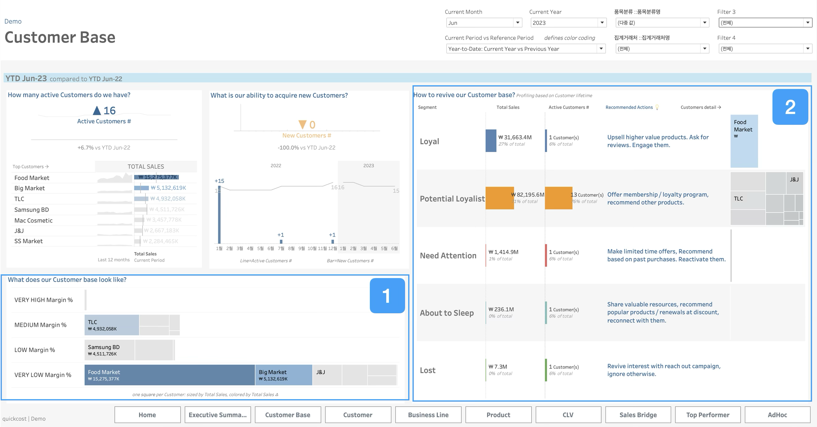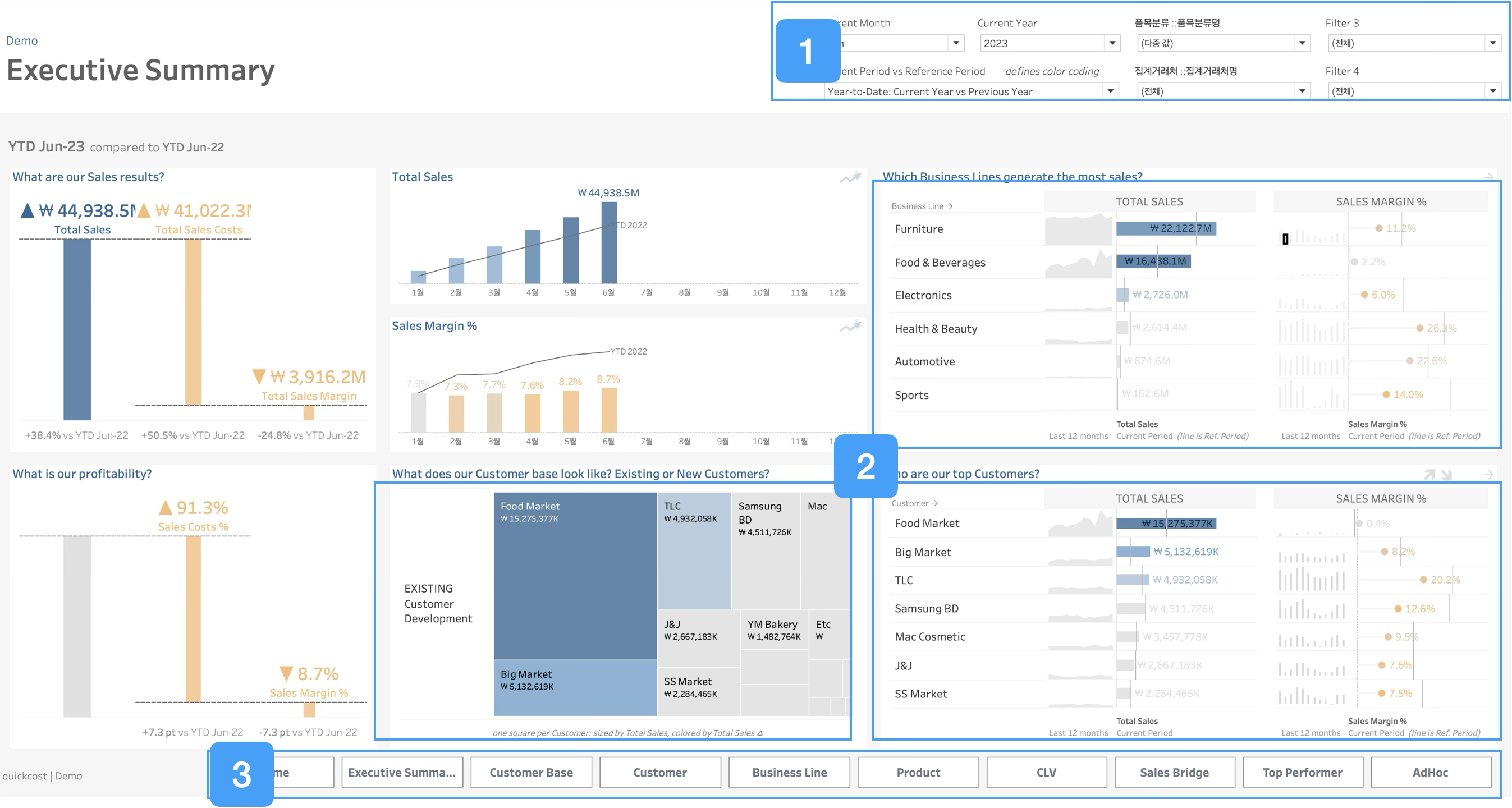 제품, 고객, 사업부문별로 이익과 매출 등 고객 관련 정보를 제공합니다.