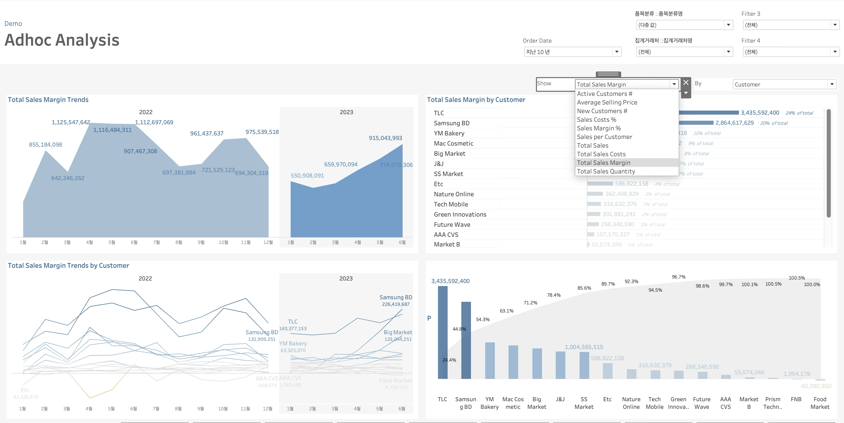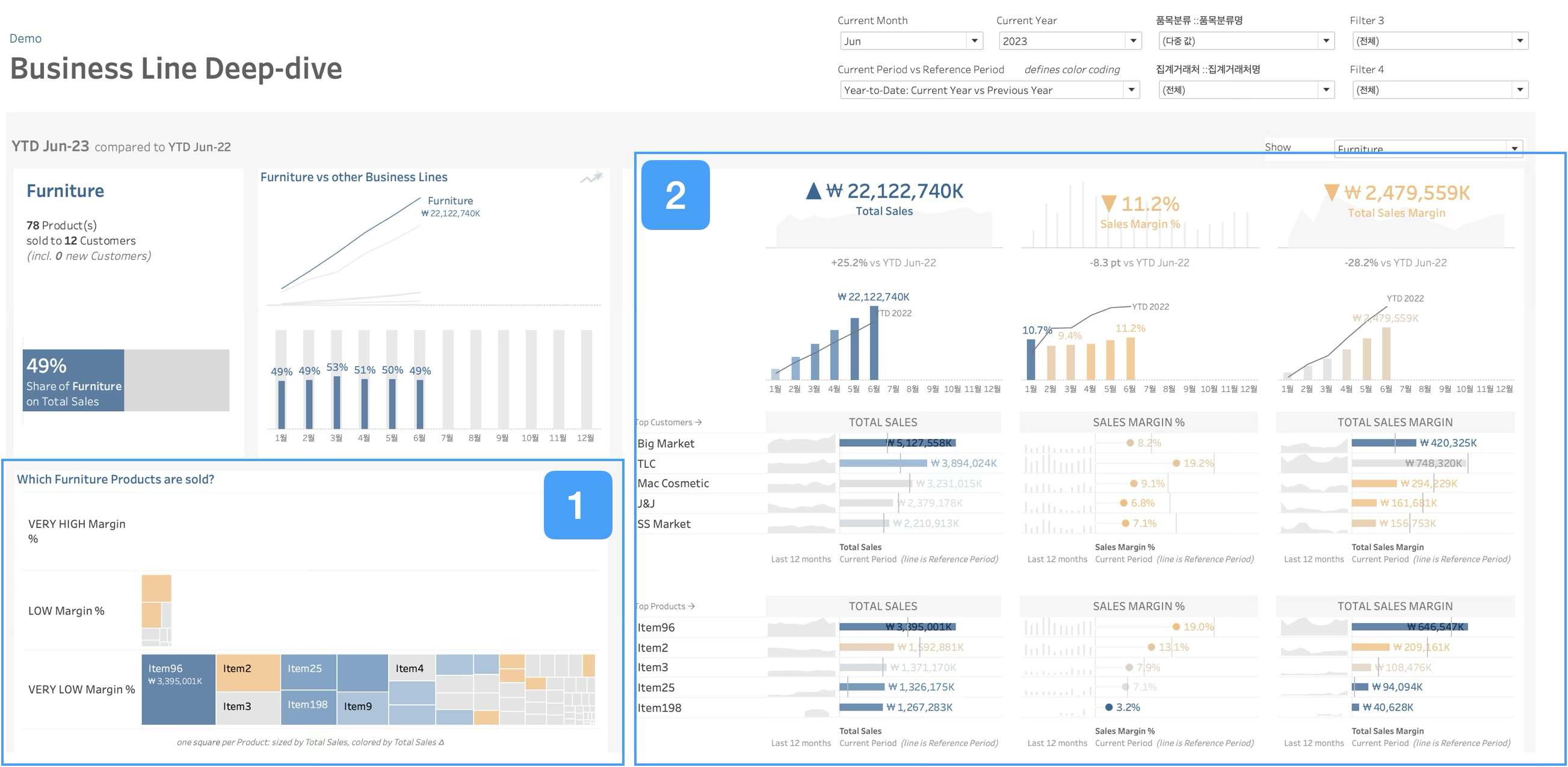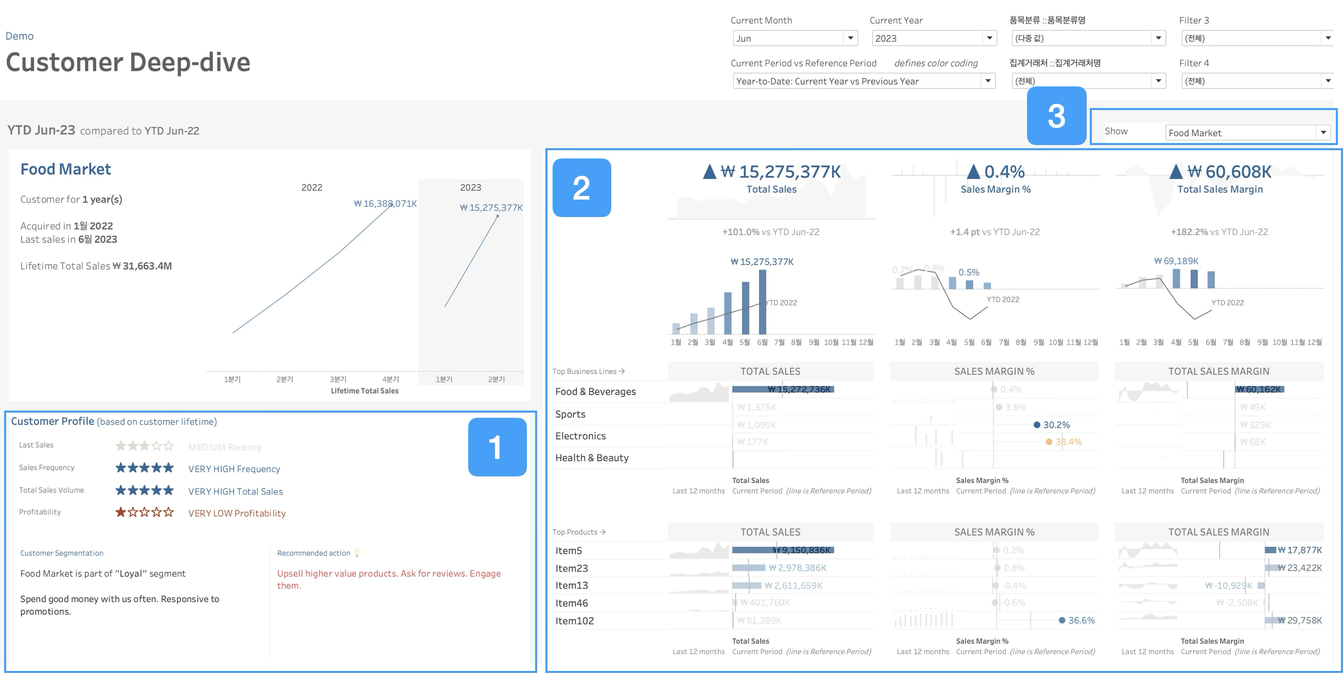 고객, 사업부, 제품 단위의 심층 분석을 할 수 있습니다.