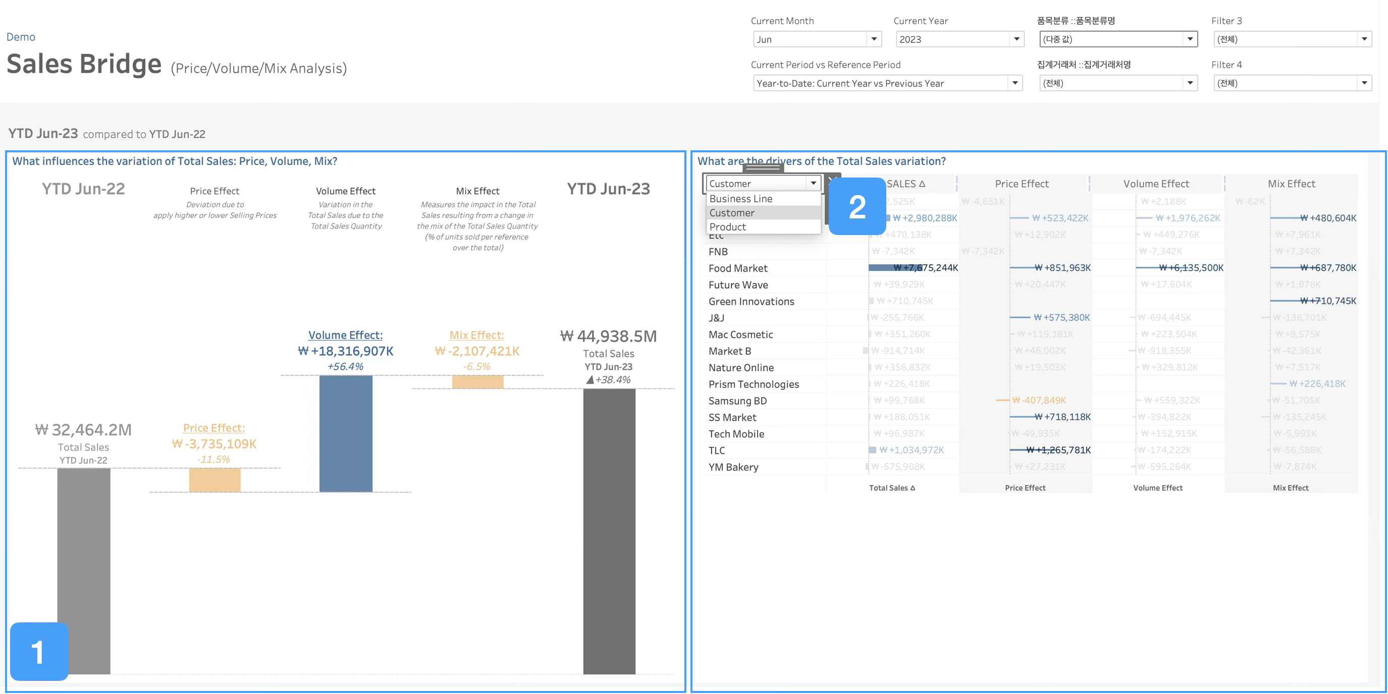 비교기간 대비 가격, 볼륨, Mix의 변화를 표시합니다.