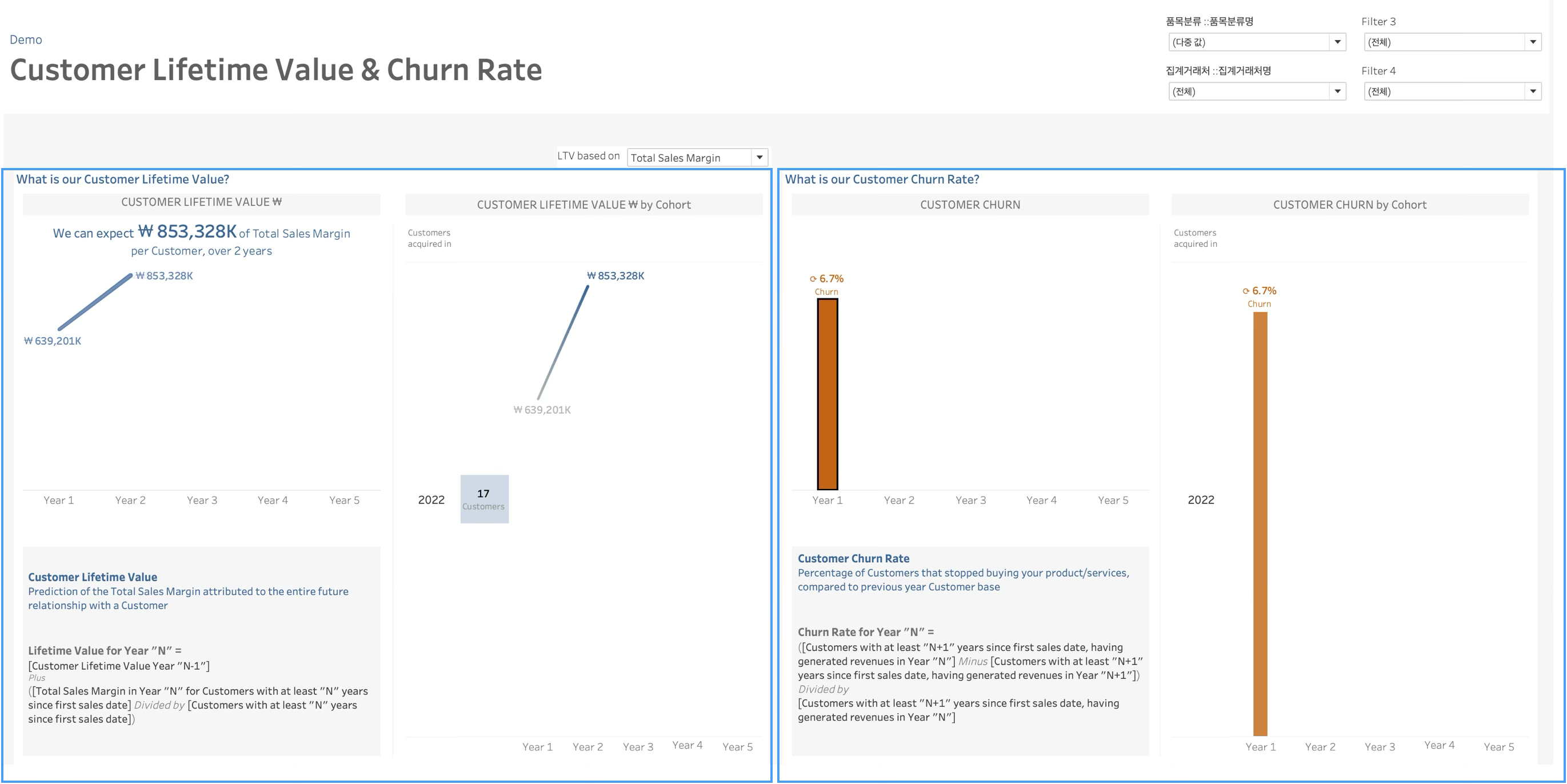 고객 생애 가치와 이탈률을 확인할 수 있습니다.