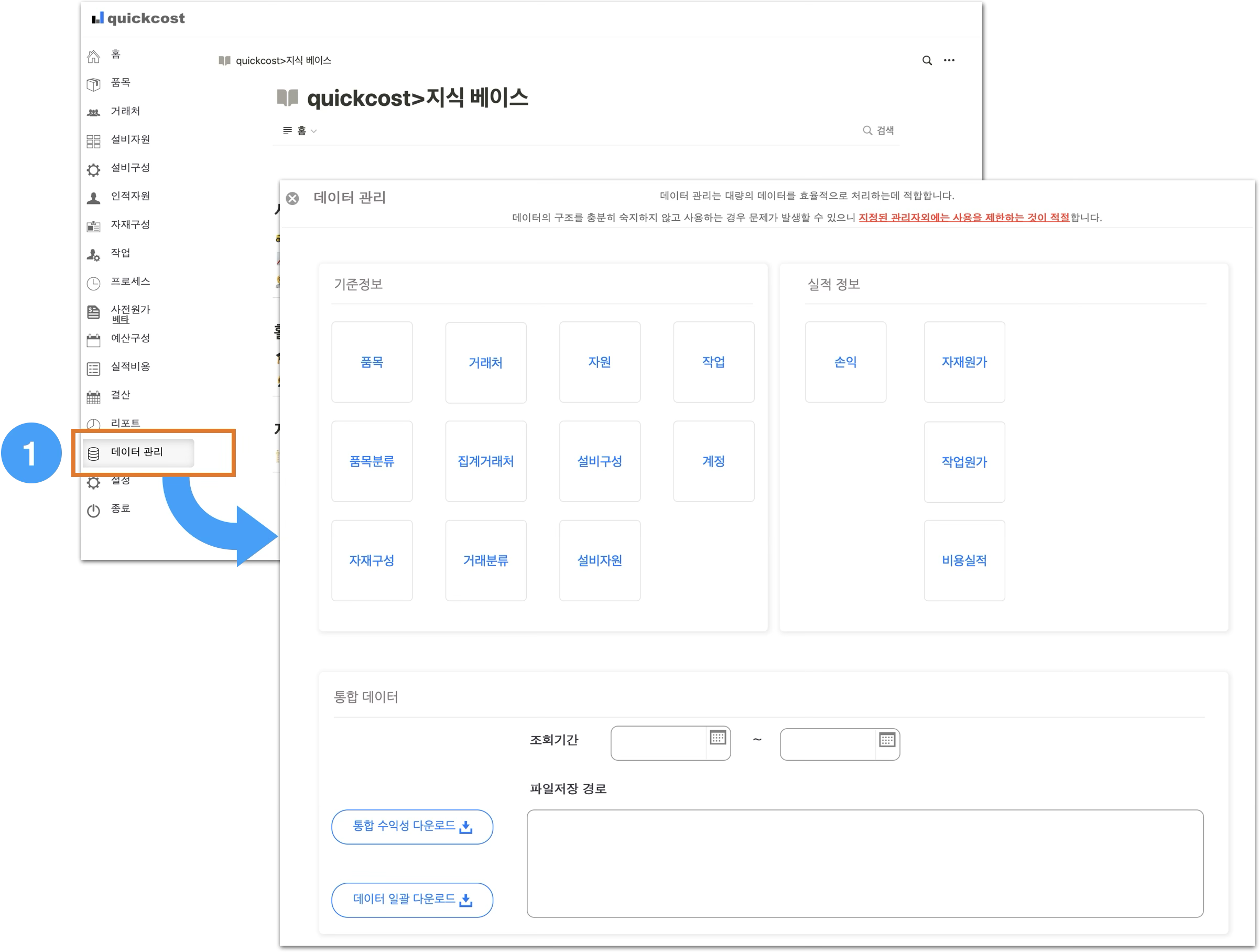 데이터 관리를 선택하세요.세부 메뉴 이동데이터 관리 메뉴 안에서 원하는 하위 메뉴를 클릭하면, 해당 기능으로 바로 이동할 수 있습니다.