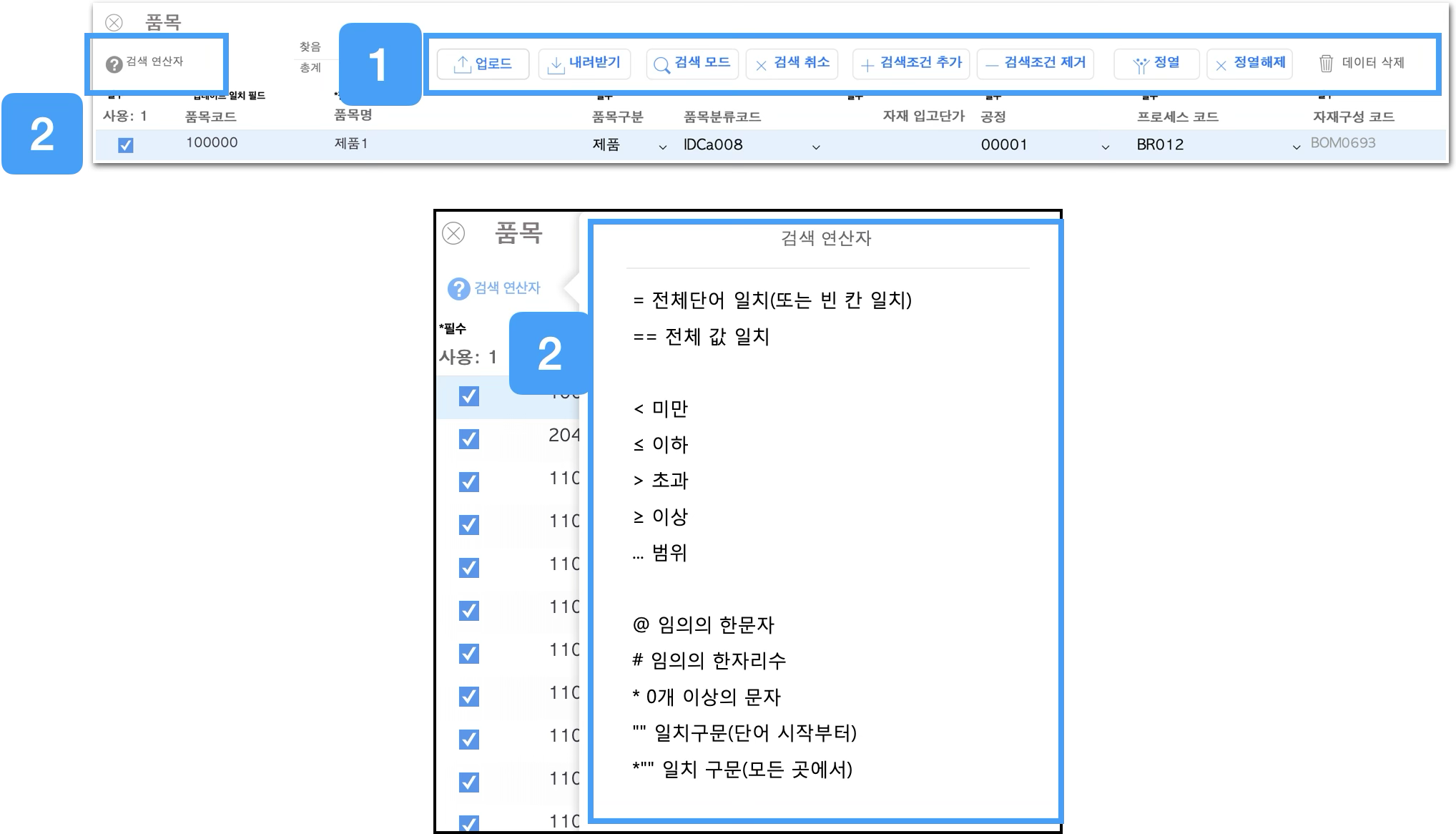 검색 연산자‘검색모드’에서 항목별 상세 조건검색을 위해 사용되는 연산자입니다.