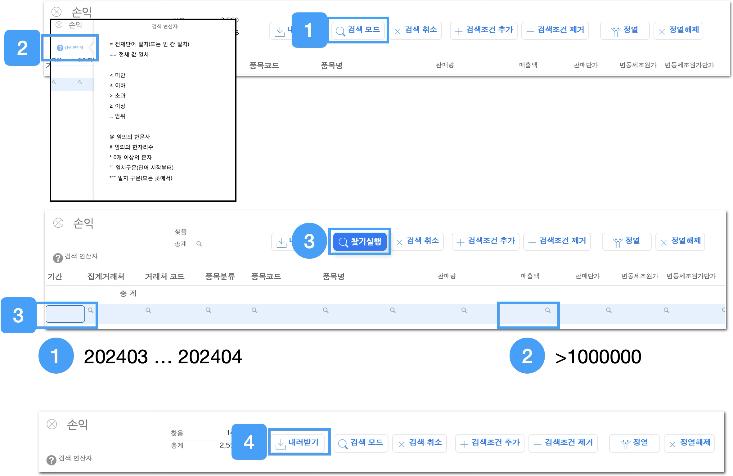 검색 조건을 반영합니다.예시) 검색 조건 1 : 2024년 3월부터 2024년 4월까지예시) 검색 조건 2 : 매출액이 100만원보다 큰 경우