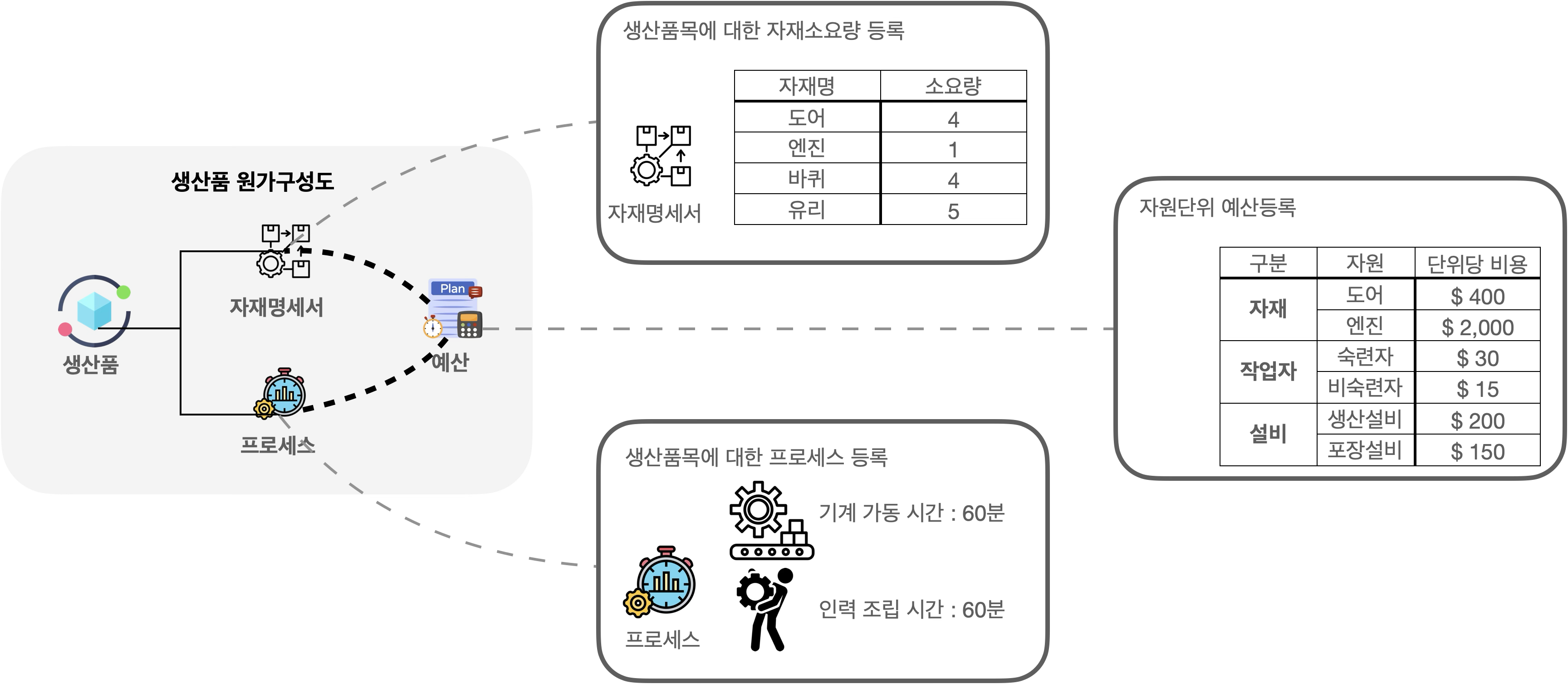 최종 제품의 생산량에 따라 각 단계에서 필요한 자재와 인력, 설비 소요 시간이 파악됩니다. 이렇게 확보된 데이터를 바탕으로 예산이 반영된 원가계산이 이루어집니다.