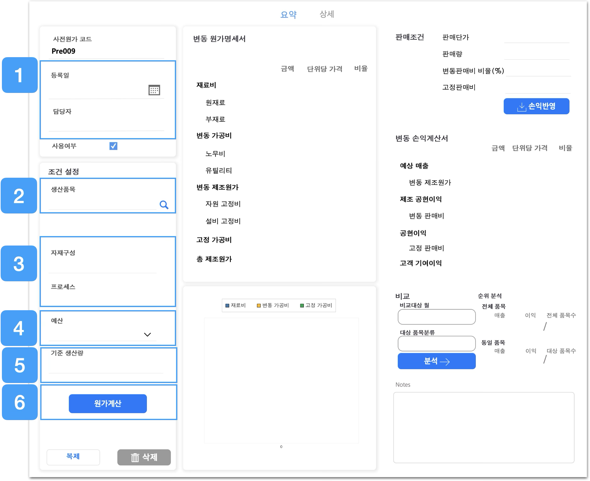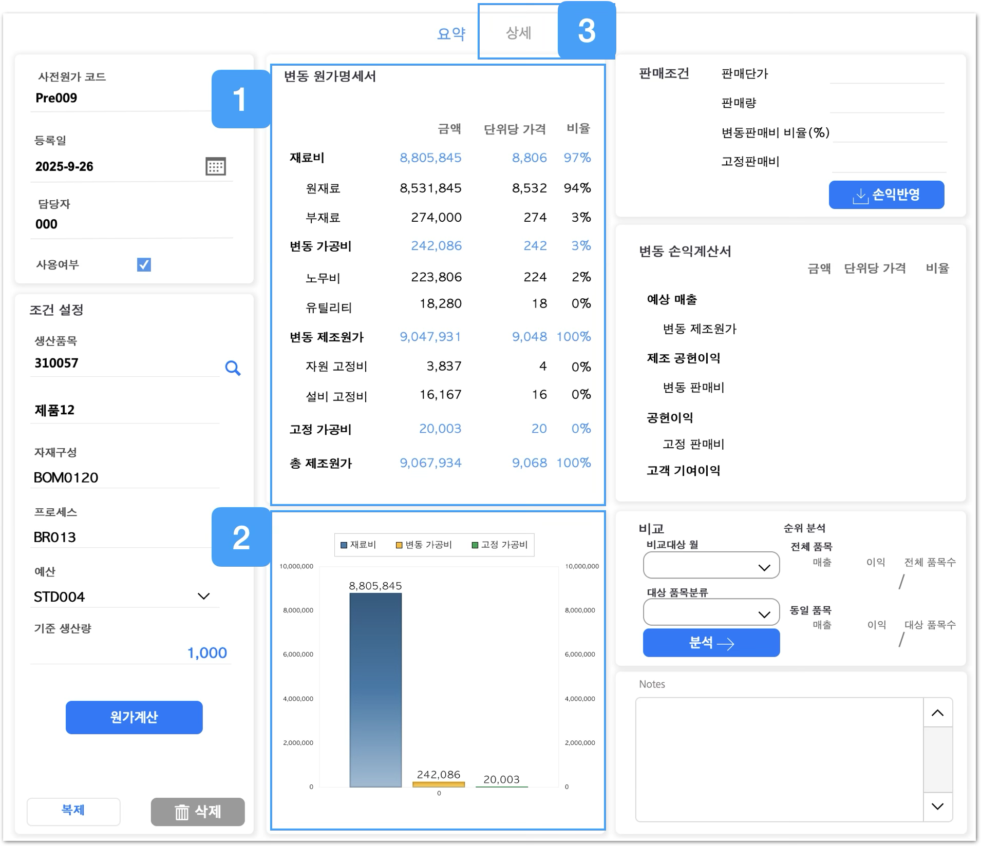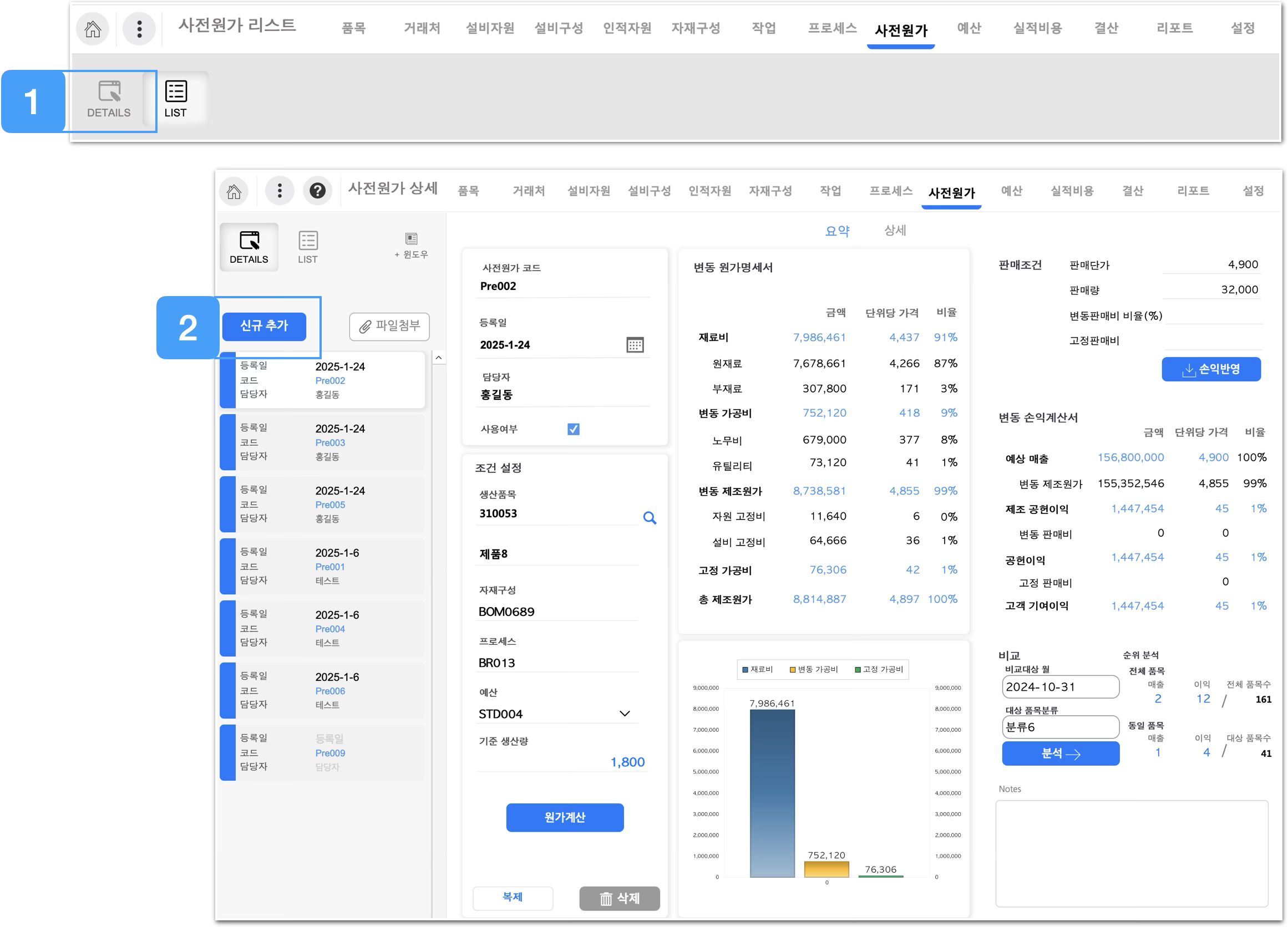 원가 상세내역 확인재료비와 가공비에 대한 상세내역을 확인합니다.
