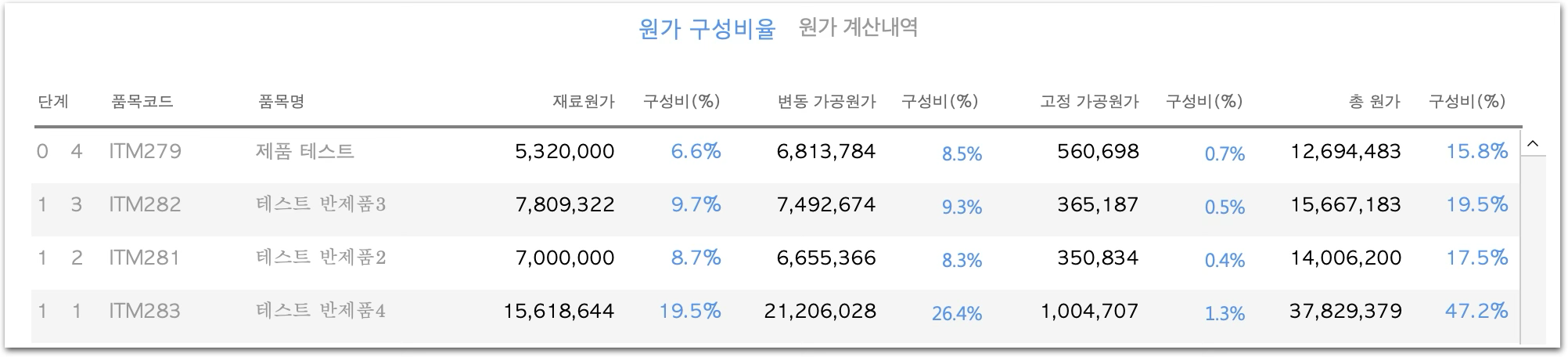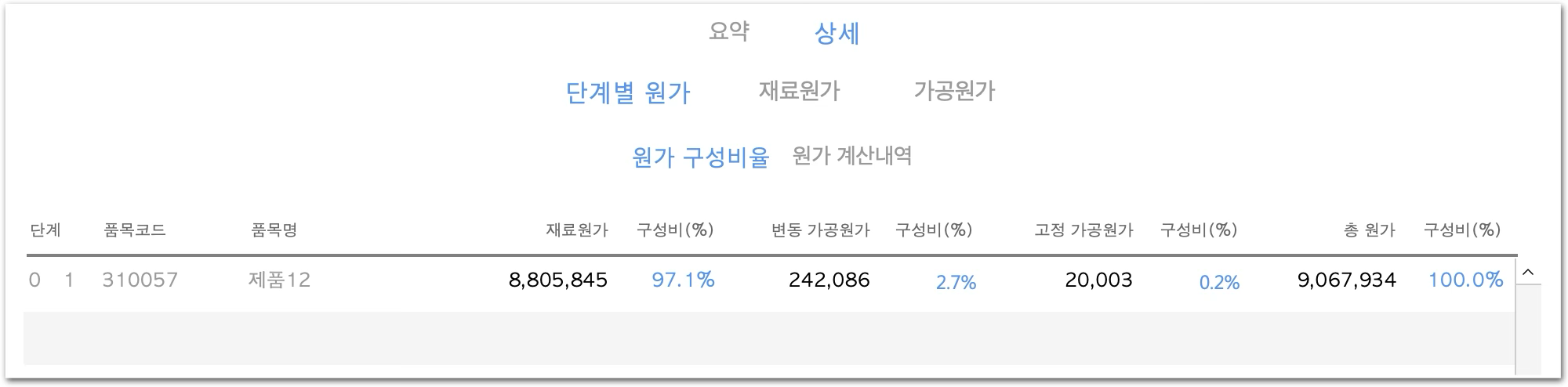 단계 표시공정의 계산순서별로 자재소요량이 반영된 원가내역을 제공합니다.