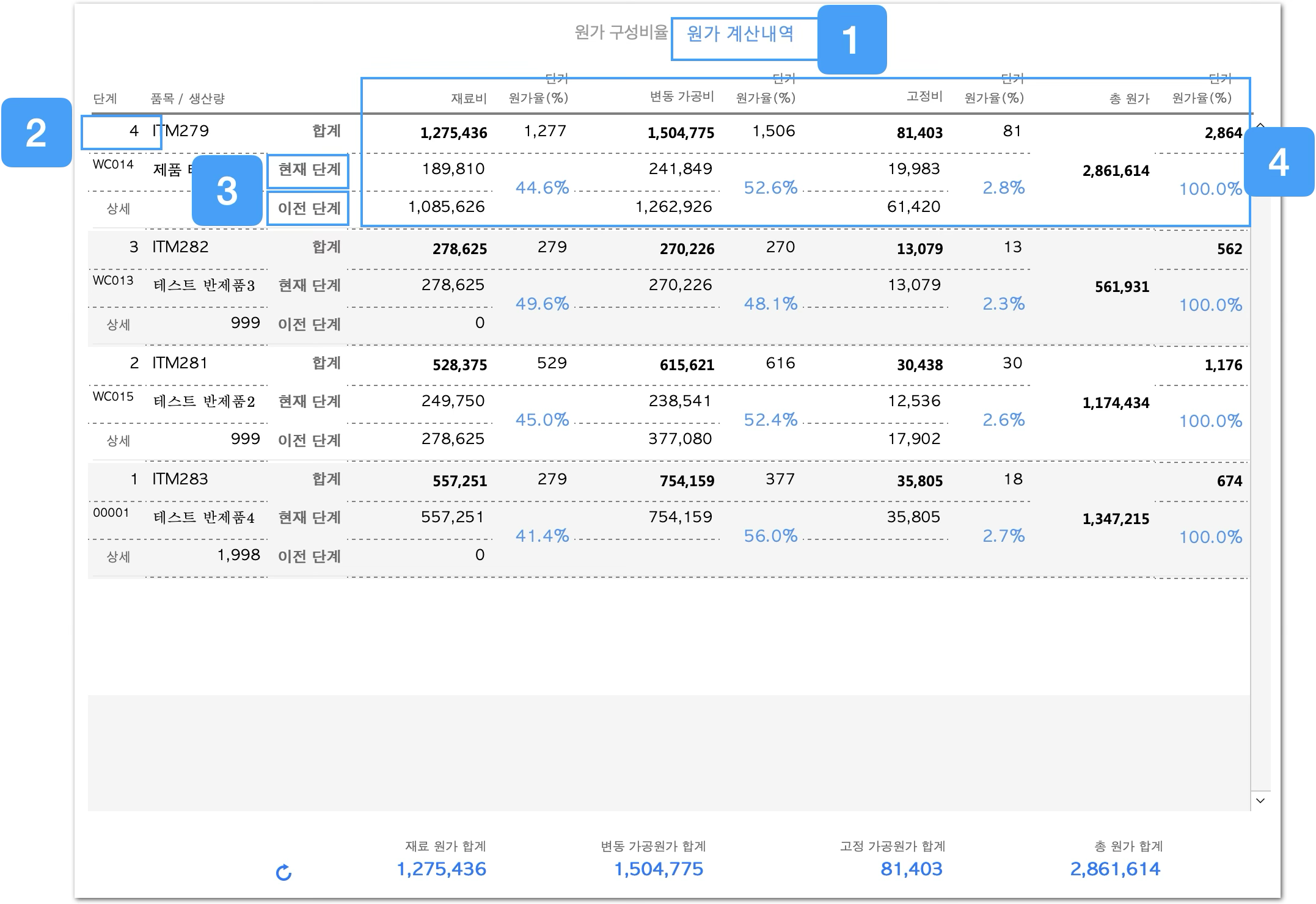 ① 단계별 원가 : 공정 단계별 원가 계산 내역을 표시합니다.