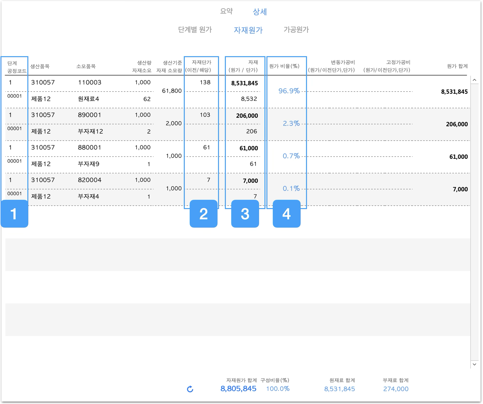 자재원가는 생산품의 자재소요량을 반영한 원가내역을 제공합니다.