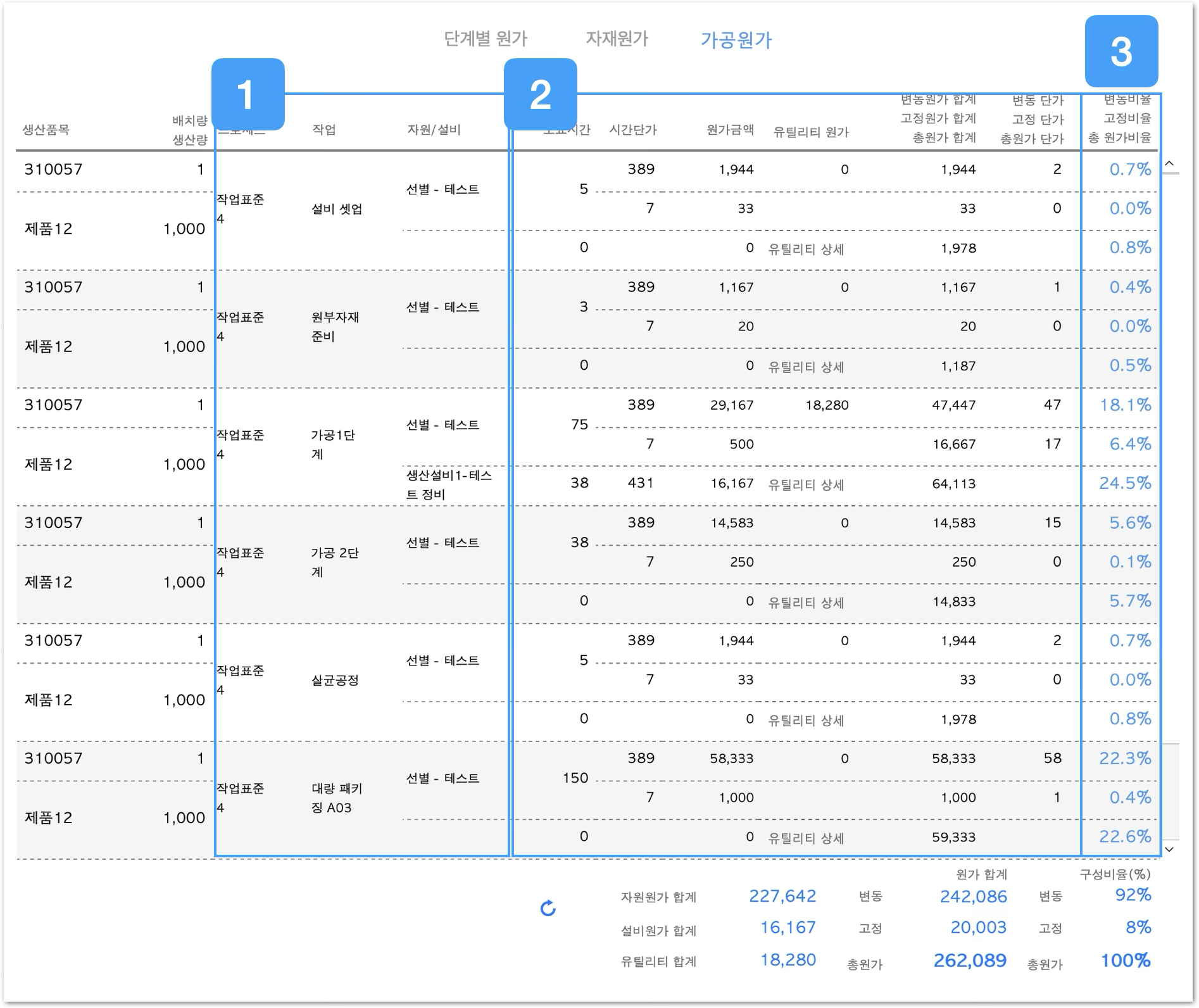 ③ 가공원가 : 생산품의 프로세스에 사용된 원가 내역을 표시합니다.
