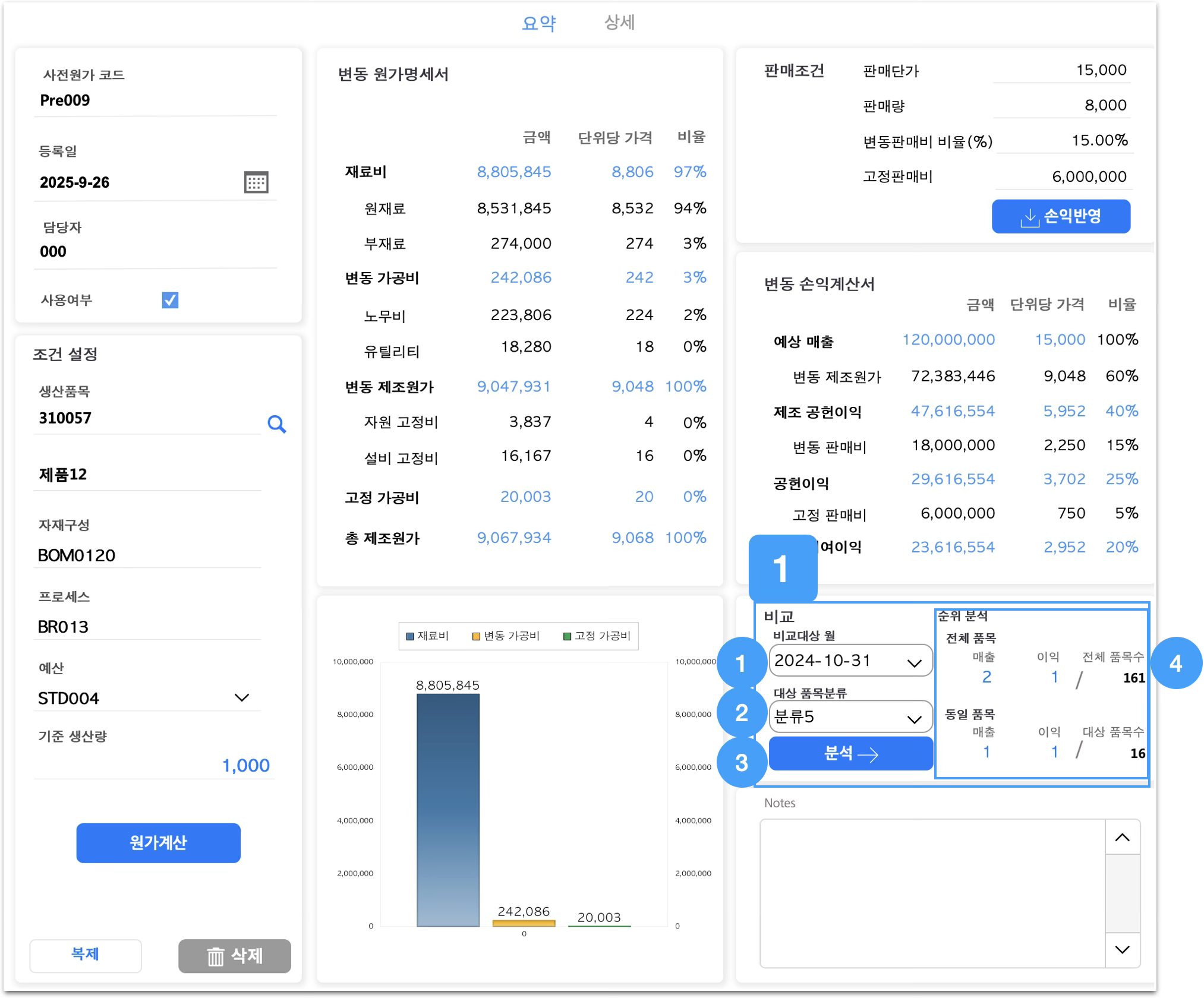 예상 손익계산서를 확인합니다.판매조건을 변경하며 적정수준의 수익성을 판단할 수 있습니다.