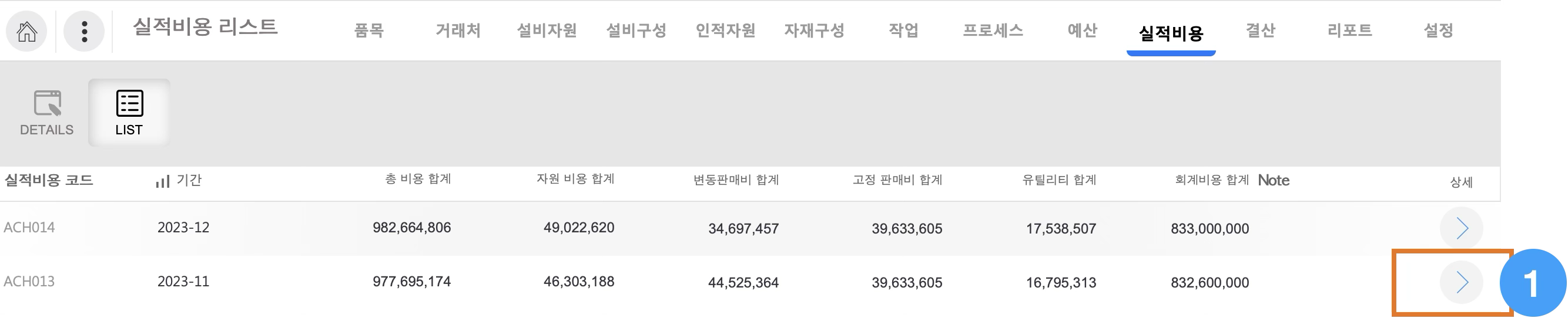 또는, 상단 메뉴버튼 > 실적비용으로 이동합니다.