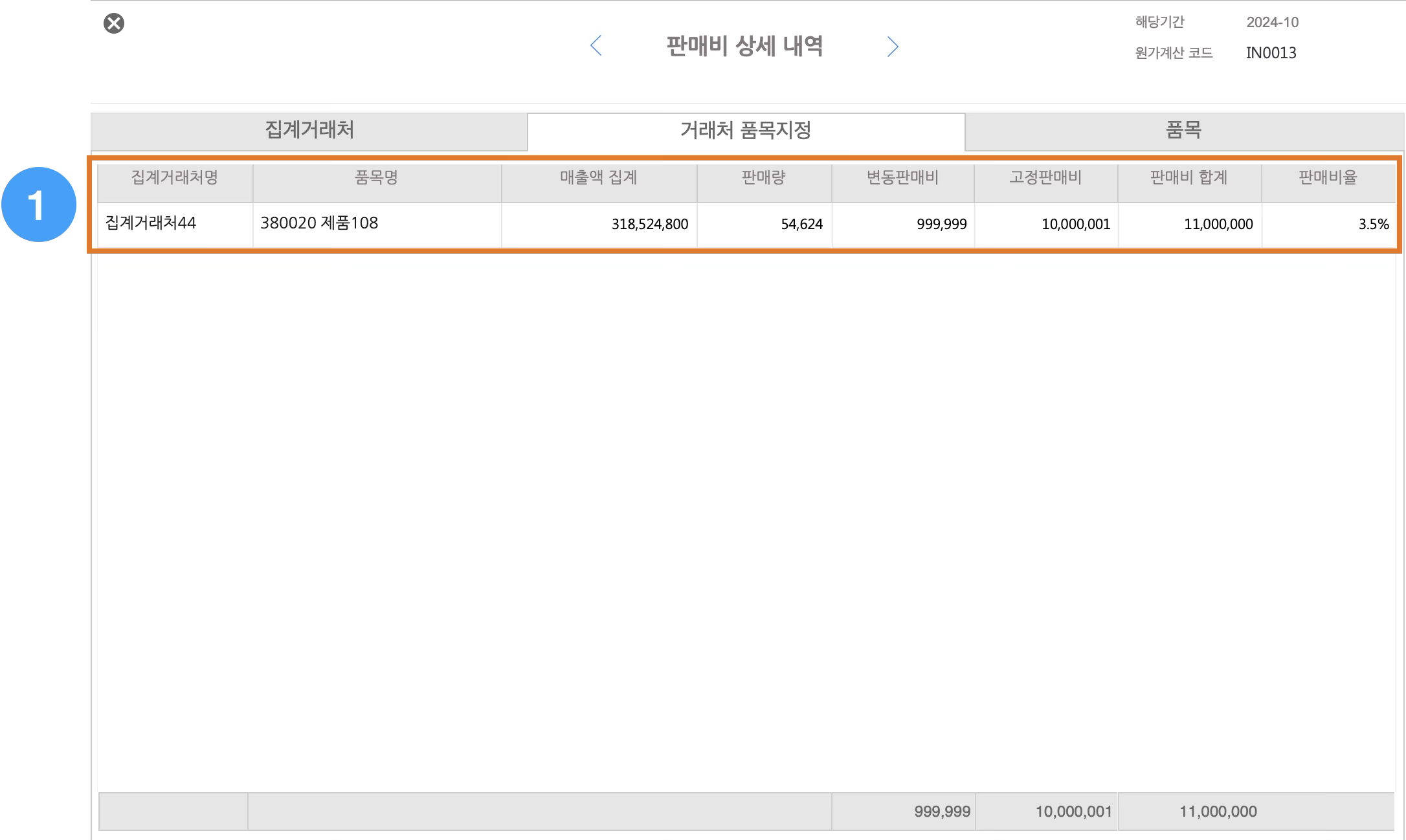 리포트 메뉴에서 조회하기먼저 상단 메뉴에서 리포트 → 판매비 상세로 이동합니다.이어서 거래처와 품목을 지정해야 합니다. 조회를 원하는 거래처와 품목을 선택하면 해당 조건에 맞는 지정판매비 데이터를 확인할 수 있습니다.