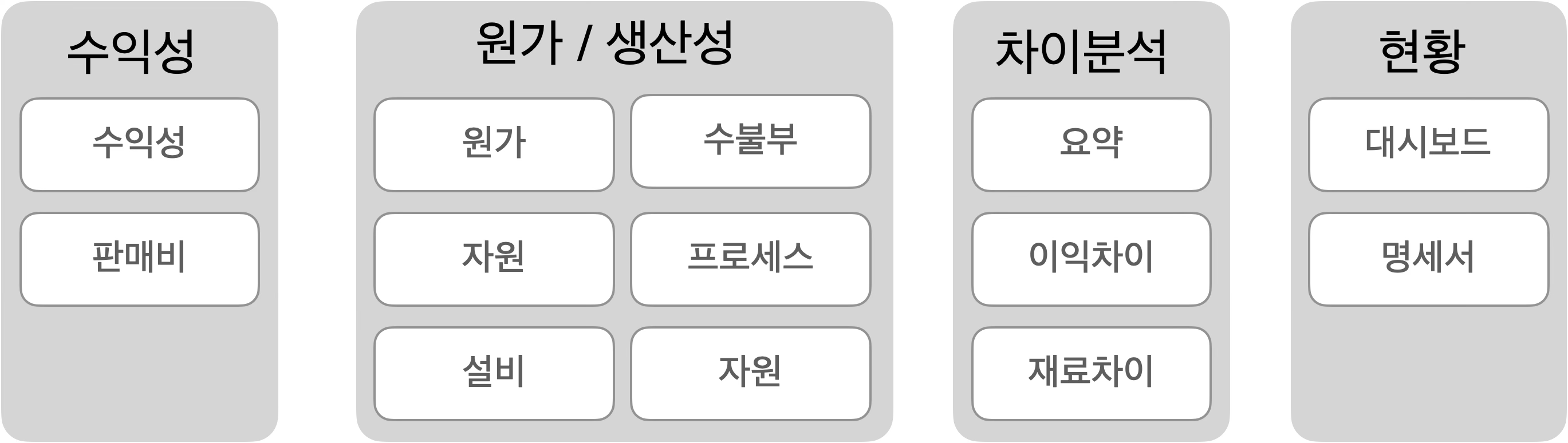 리포트는 해당 월의 수익성에 영향을 주는 요소를 분류하여 수익성, 원가/생산성, 차이분석, 현황의 구성으로 제공합니다.