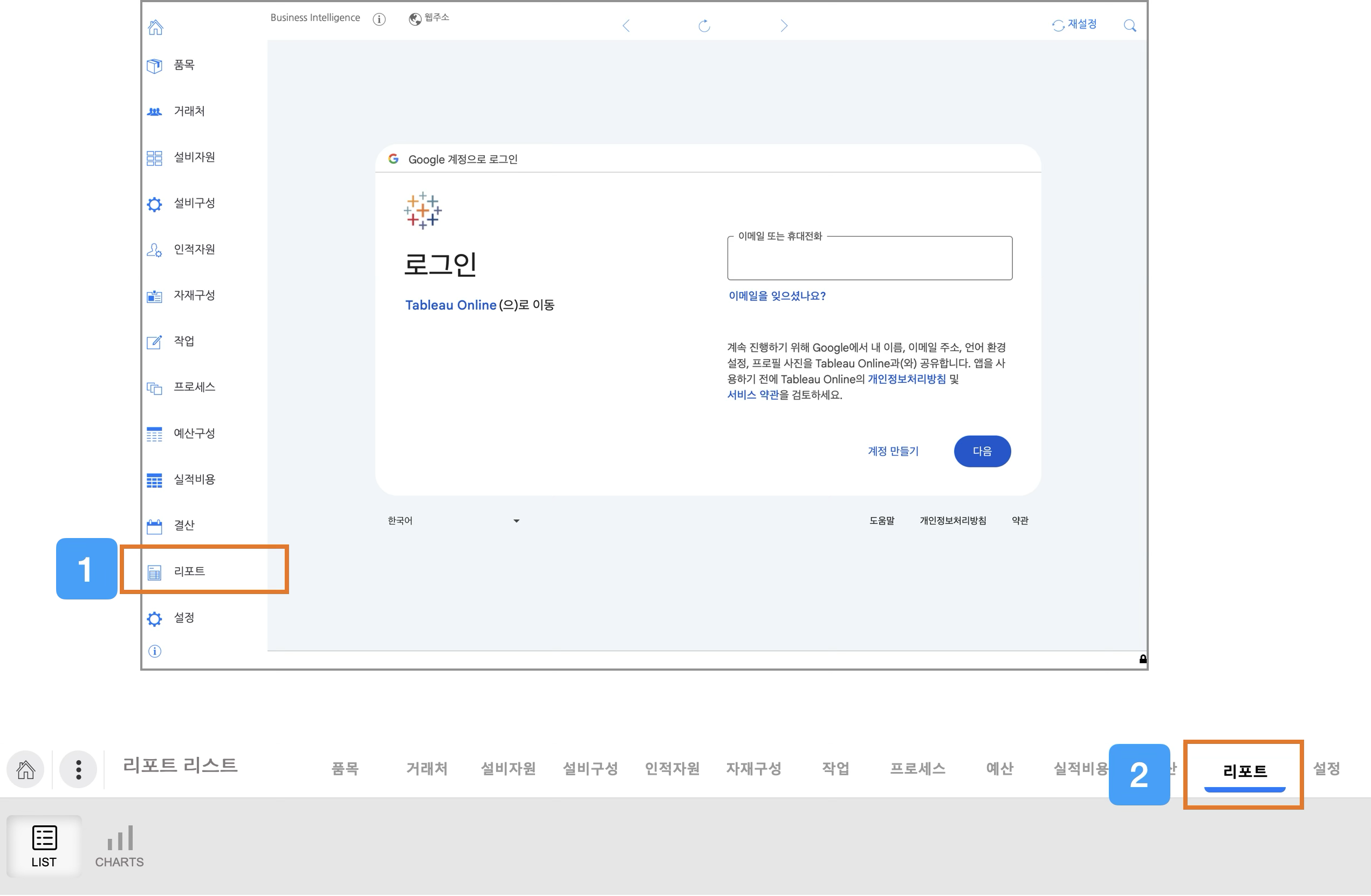 또는 화면 상단에 있는 메뉴 버튼을 클릭한 뒤 리포트를 선택합니다.