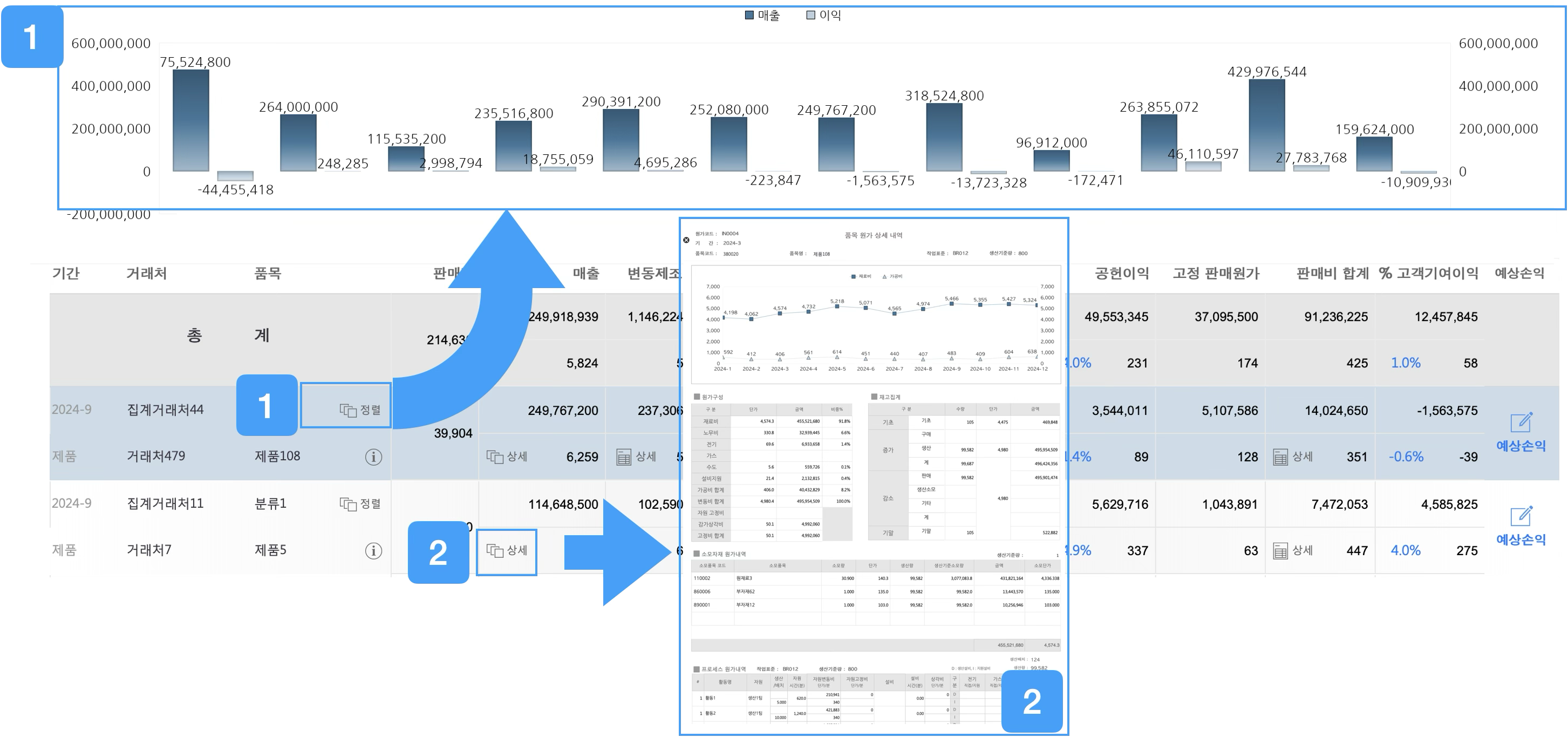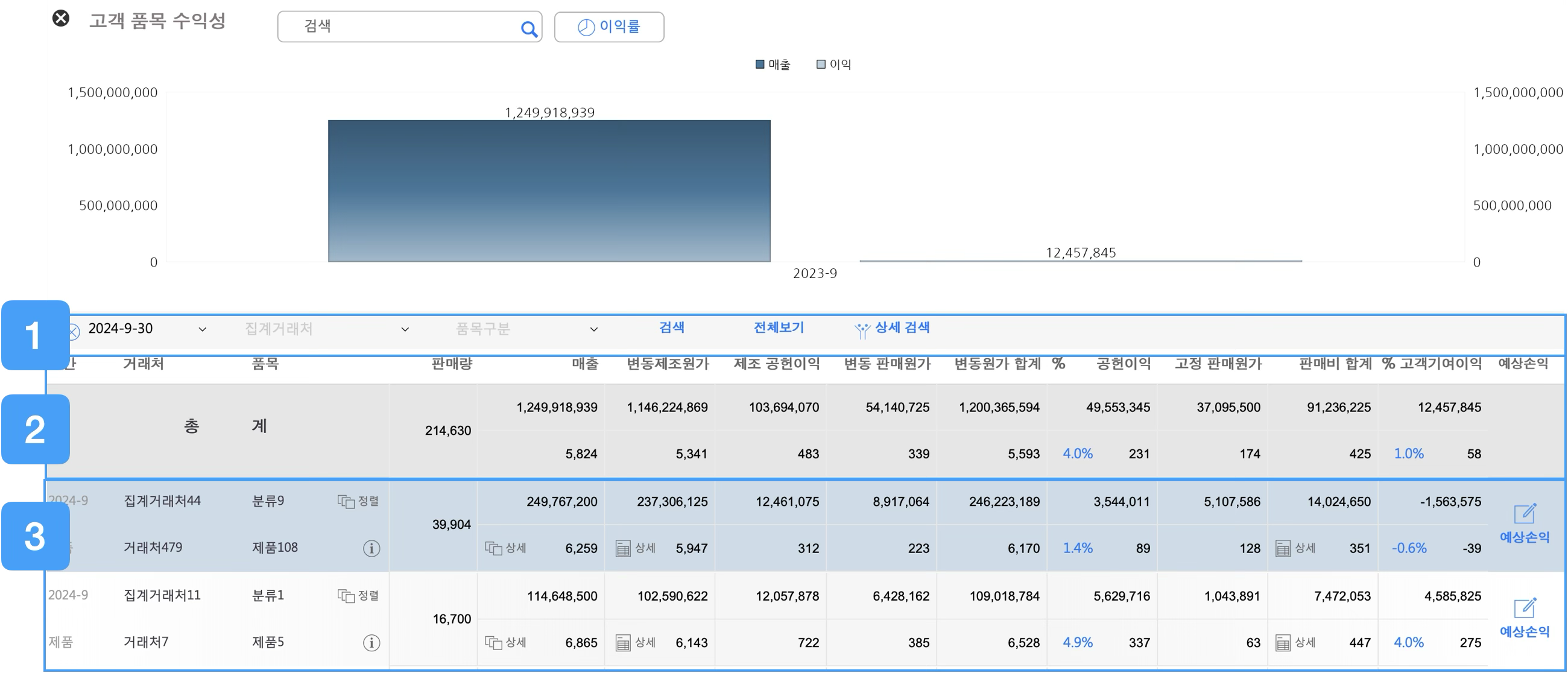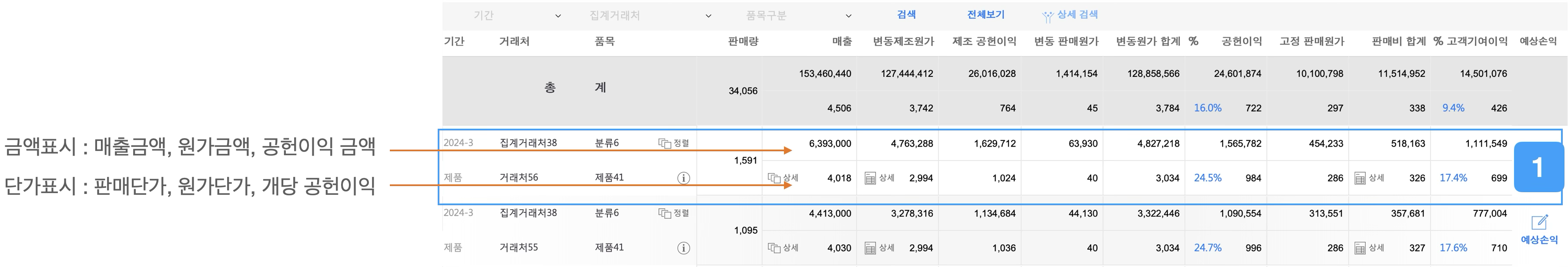 특정 고객이나 품목별로 수익성 정보를 확인할 수 있습니다.