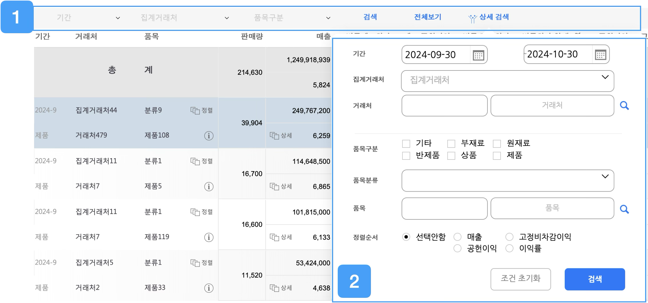 원하는 기간과 거래처, 품목 구분을 선택하여 데이터를 조회할 수 있습니다.