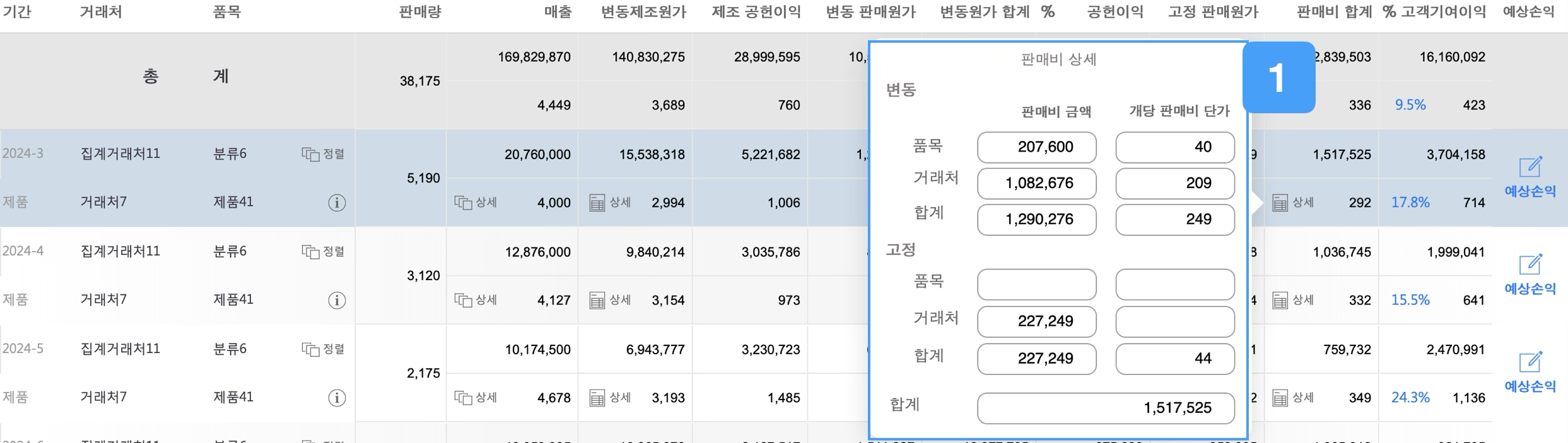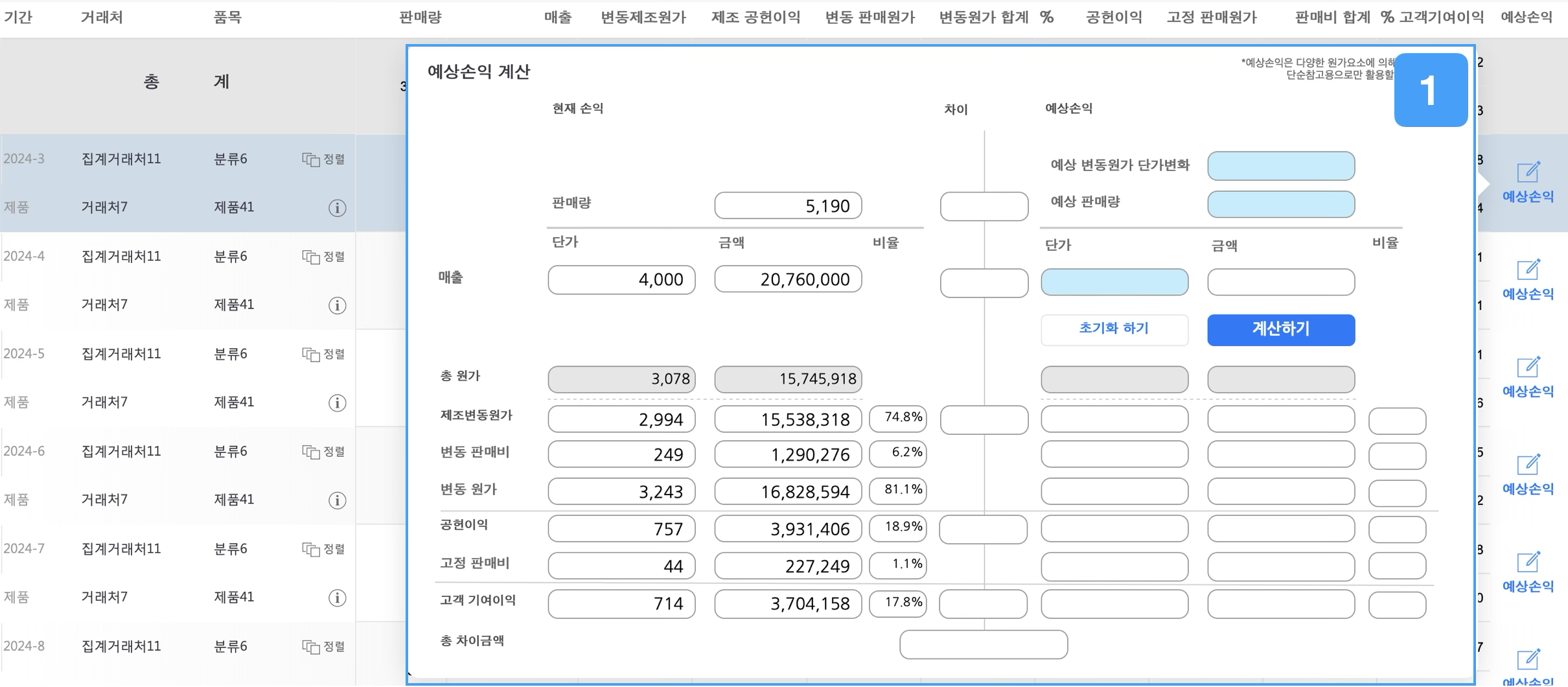 1. 예상손익해당월의 거래처와 품목의 원가를 기준으로, 원가·판매량·판매단가의 변동에 따른 예상손익 정보를 제공합니다.