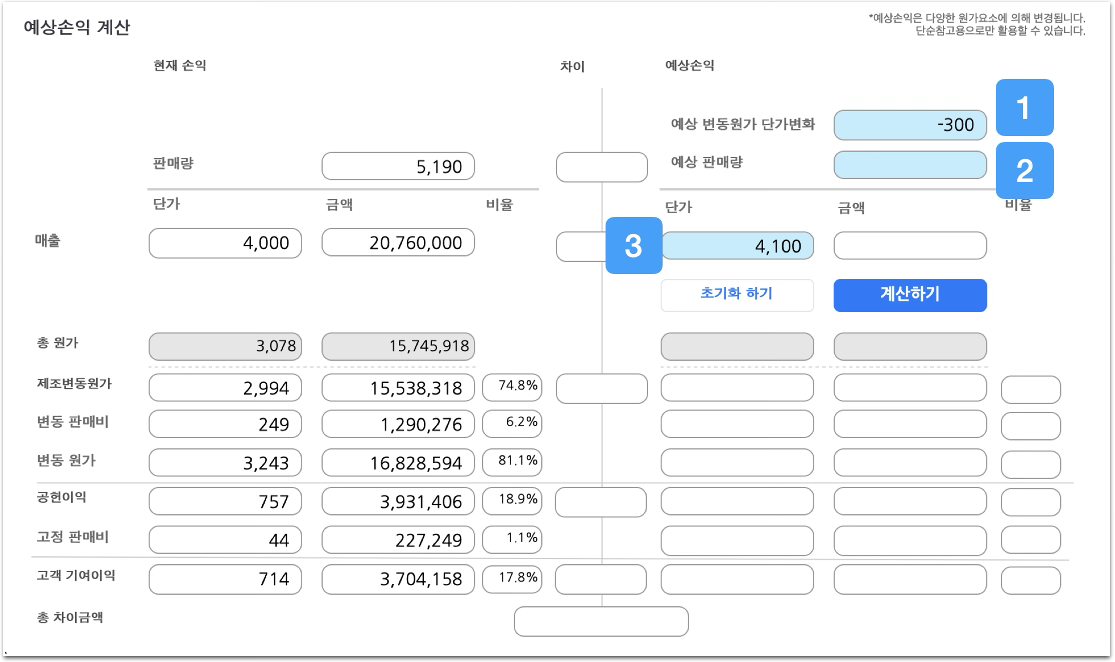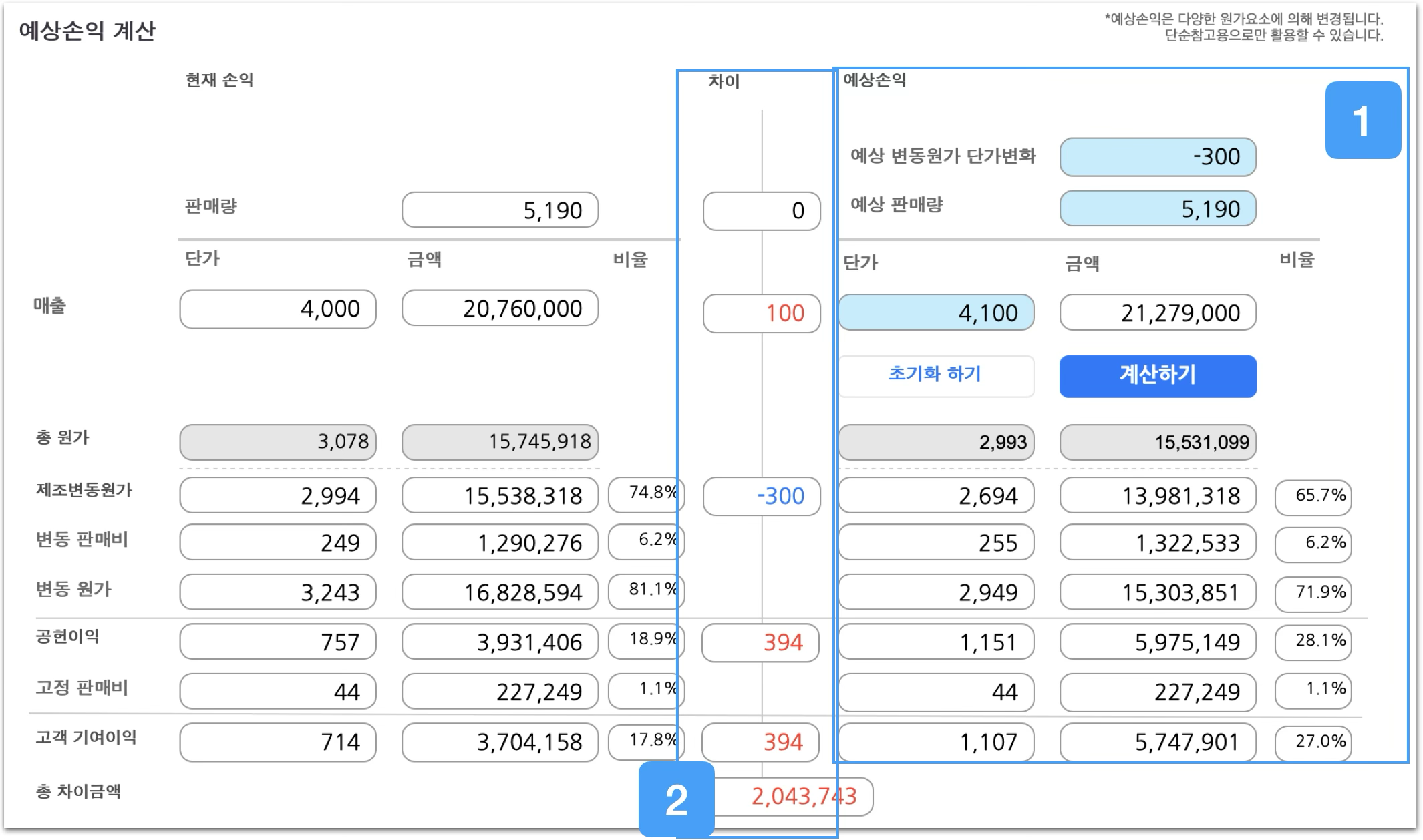 차이분석입력한 값에 따라 예상손익과 현재손익의 차이를 확인할 수 있습니다.